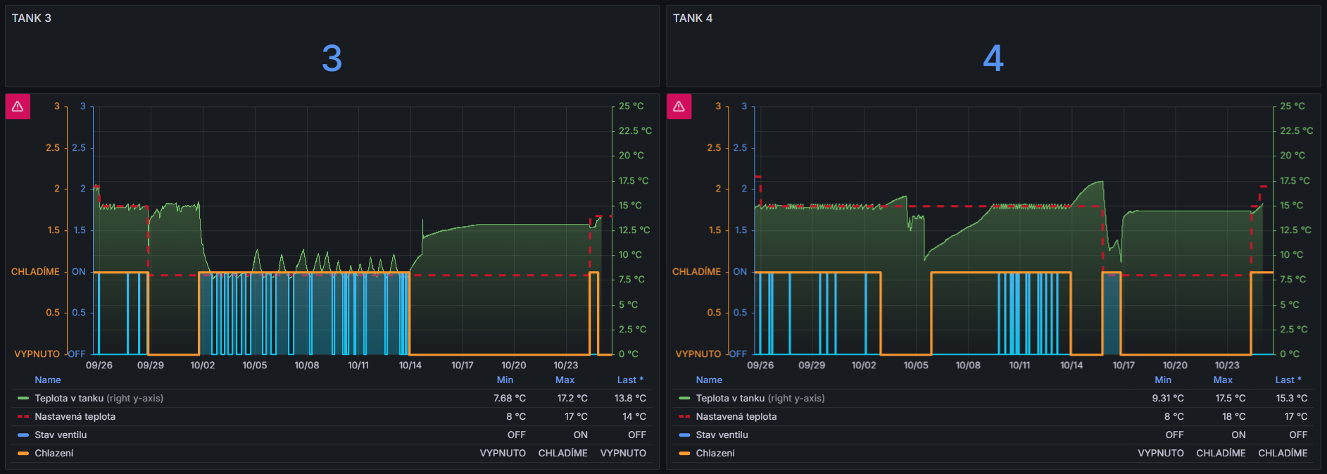 Tato data jsou ukládána do databáze InfluxDB a vizualizována v Grafana, kde lze sledovat závislost teploty moštu na přeměně cukrů na alkohol. Systém tak poskytuje vinaři cenný nástroj pro vyhodnocení průběhu kvašení.