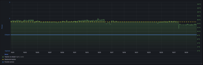 Systém průběžně měří teplotu, relativní vlhkost a koncentraci CO₂ ve sklepě. Tyto hodnoty jsou ukládány do databáze InfluxDB a zobrazovány v Grafana, kde lze sledovat jejich dlouhodobý vývoj a reagovat na klima ve výrobních prostorech.