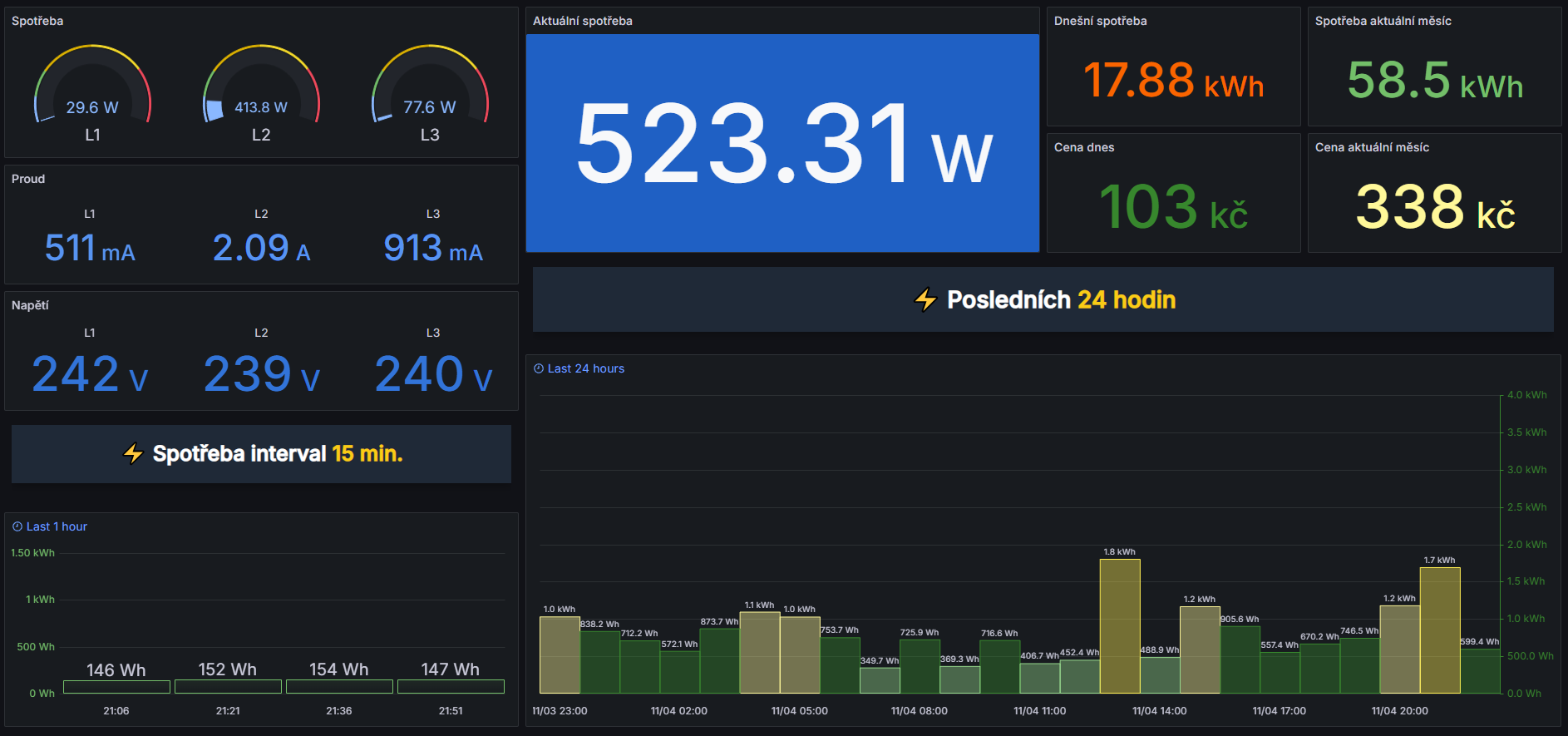 • 15 minutová, denní a měsíční spotřeba,