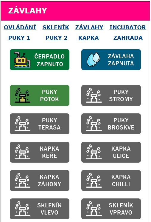 Zahradní zavlažování je rozděleno do deseti sekcí podle typu výsadby (trávník, stromy, keře, záhony, skleník atd.).