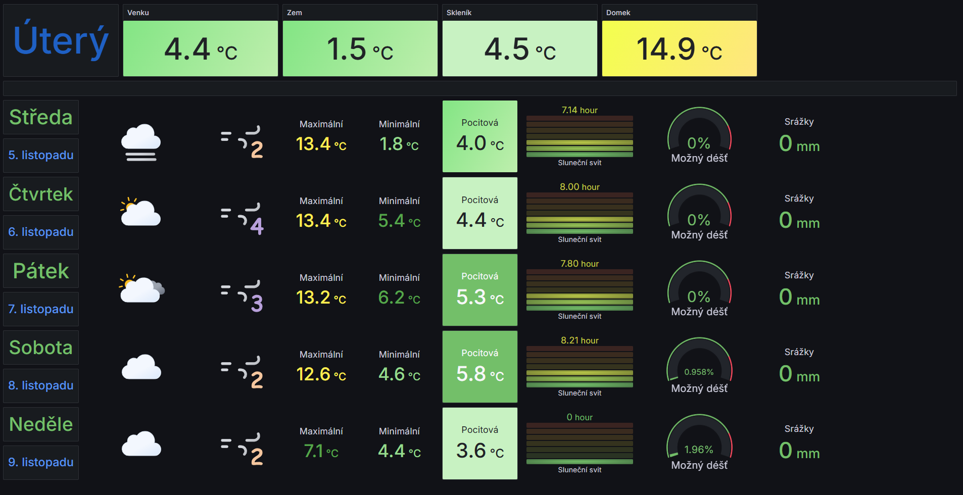 Tento modul kombinuje informace z realných teplotních čidel, rozmýstněných po domácnosti a také  zobrazuje předpověď počasí z OPEN METEO.