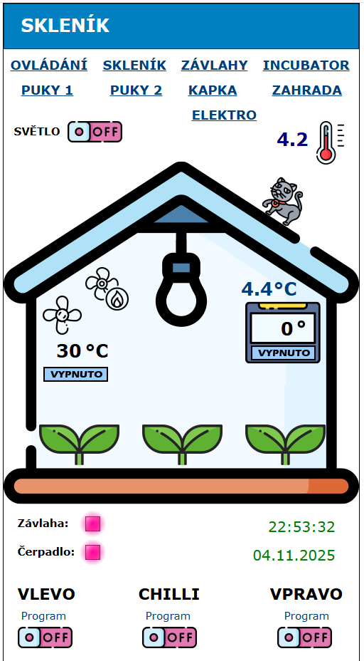 Skleník je řízen programem, který sleduje teplotu a vlhkost půdy.