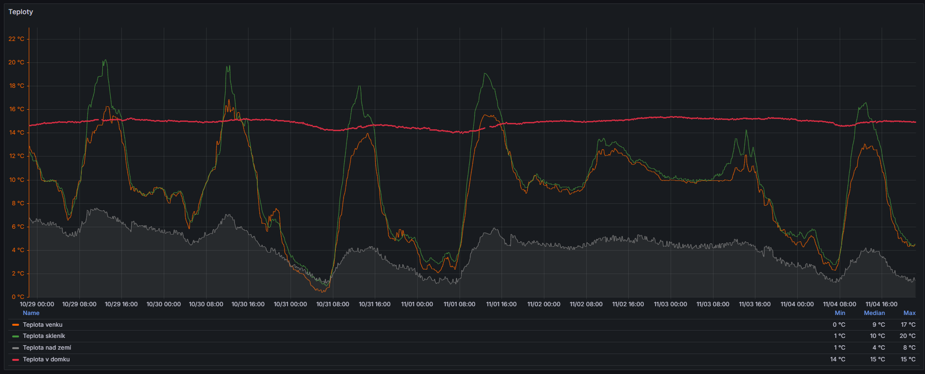Všechna data (teplota, vlhkost, světelný režim) jsou průběžně ukládána do databáze InfluxDB a zobrazována v Grafaně. To umožňuje sledovat mikroklima a optimalizovat pěstební podmínky.