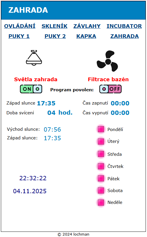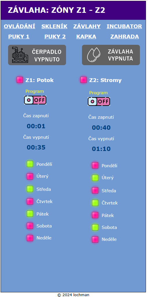 • automatické spouštění čerpadla a ventilů podle týdenního plánu,